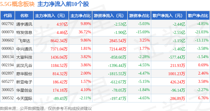 从资金流向上来看,当日5.5G概念板块主力资金净流出1.06亿元,游资资金净流入4048.09万元,散户资金净流入6563.12万元。5.5G概念板块个股资金流向见下表: