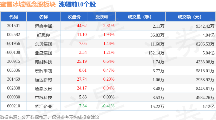 证券之星消息,12月22日蜜雪冰城概念股板块较上一交易日上涨0.03%,恒鑫生活领涨。当日上证指数报收于3917.36,上涨0.69%。深证成指报收于13332.73,上涨1.47%。蜜雪冰城概念股板块个股涨跌见下表: