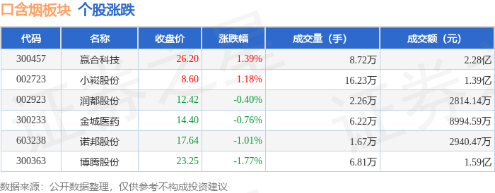 证券之星消息,12月22日口含烟板块较上一交易日下跌0.08%,博腾股份领跌。当日上证指数报收于3917.36,上涨0.69%。深证成指报收于13332.73,上涨1.47%。口含烟板块个股涨跌见下表: