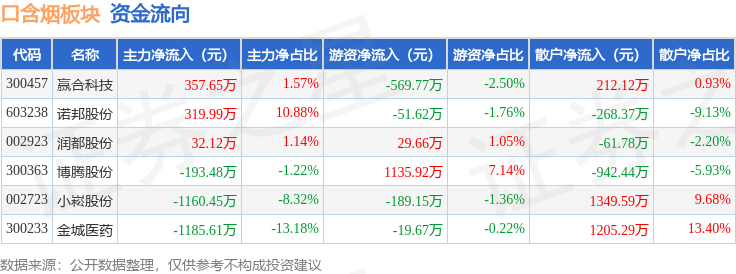 从资金流向上来看,当日口含烟板块主力资金净流出1829.78万元,游资资金净流入335.37万元,散户资金净流入1494.41万元。口含烟板块个股资金流向见下表: