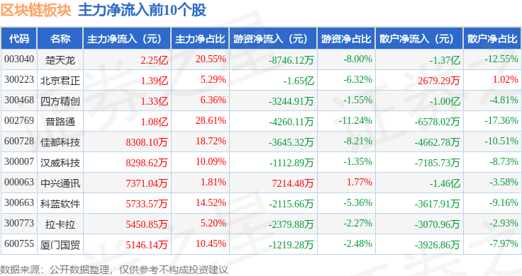 从资金流向上来看,当日区块链板块主力资金净流出16.45亿元,游资资金净流入9886.44万元,散户资金净流入15.46亿元。区块链板块个股资金流向见下表: