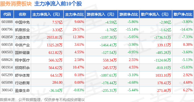 从资金流向上来看,当日服务消费板块主力资金净流入4.52亿元,游资资金净流出6.59亿元,散户资金净流入2.07亿元。服务消费板块个股资金流向见下表: