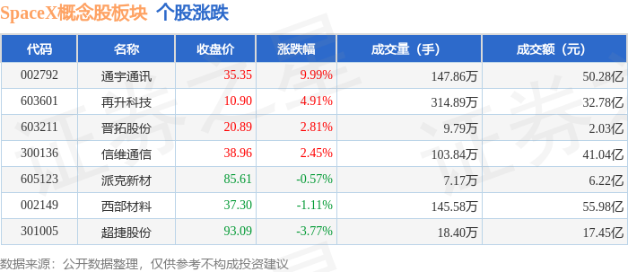 证券之星消息,12月22日SpaceX概念股板块较上一交易日上涨1.77%,通宇通讯领涨。当日上证指数报收于3917.36,上涨0.69%。深证成指报收于13332.73,上涨1.47%。SpaceX概念股板块个股涨跌见下表: