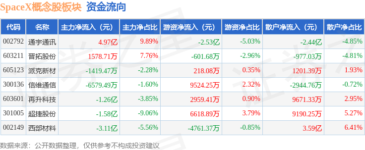 从资金流向上来看,当日SpaceX概念股板块主力资金净流出1.63亿元,游资资金净流出1.13亿元,散户资金净流入2.76亿元。SpaceX概念股板块个股资金流向见下表: