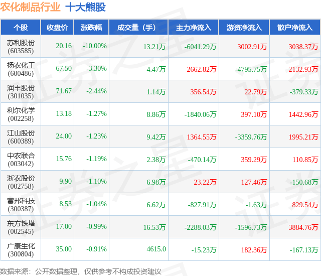 个股表现方面,农化制品行业当日领跌股为苏利股份(603585),该股当日报收20.16,下跌10.0%,成交量13.21万,主力资金净流出6041.29万元。扬农化工(600486)以下跌3.3%紧随其后,该股当日成交量4.47万,主力资金净流入2662.82万元。除此之外,润丰股份(301035)、利尔化学(002258)、江山股份(600389)均进入当日熊股之列。具体个股列表见下表: