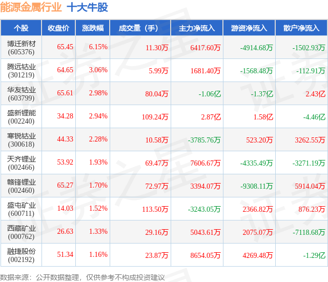 个股表现方面,能源金属行业当日领涨股为博迁新材(605376),该股当日报收65.45,上涨6.15%,成交量11.3万,主力资金净流入6417.6万元。腾远钴业(301219)以上涨3.06%紧随其后,该股当日成交量5.99万,主力资金净流入1681.4万元。除此之外,华友钴业(603799)、盛新锂能(002240)、寒锐钴业(300618)均进入当日牛股之列。具体个股列表见下表:
