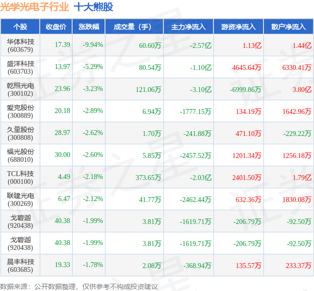 个股表现方面,光学光电子行业当日领跌股为华体科技(603679),该股当日报收17.39,下跌9.94%,成交量60.6万,主力资金净流出2.57亿元。盛洋科技(603703)以下跌5.29%紧随其后,该股当日成交量80.54万,主力资金净流出1.1亿元。除此之外,乾照光电(300102)、爱克股份(300889)、久量股份(300808)均进入当日熊股之列。具体个股列表见下表: