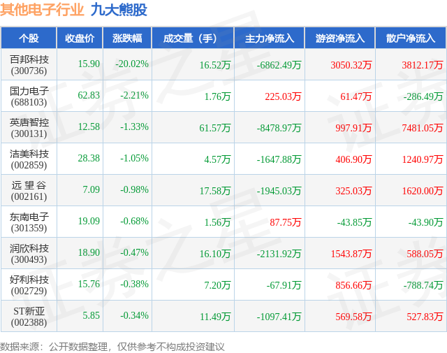 个股表现方面,其他电子行业当日领跌股为百邦科技(300736),该股当日报收15.9,下跌20.02%,成交量16.52万,主力资金净流出6862.49万元。国力电子(688103)以下跌2.21%紧随其后,该股当日成交量1.76万,主力资金净流入225.03万元。除此之外,英唐智控(300131)、洁美科技(002859)、远 望 谷(002161)均进入当日熊股之列。具体个股列表见下表: