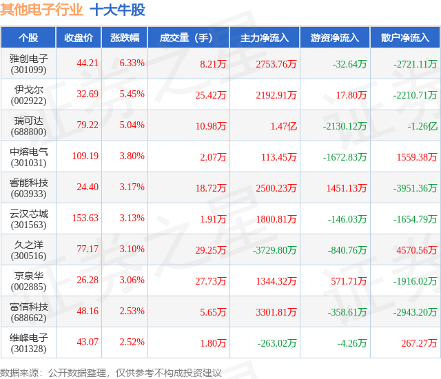 个股表现方面,其他电子行业当日领涨股为雅创电子(301099),该股当日报收44.21,上涨6.33%,成交量8.21万,主力资金净流入2753.76万元。伊戈尔(002922)以上涨5.45%紧随其后,该股当日成交量25.42万,主力资金净流入2192.91万元。除此之外,瑞可达(688800)、中熔电气(301031)、睿能科技(603933)均进入当日牛股之列。具体个股列表见下表: