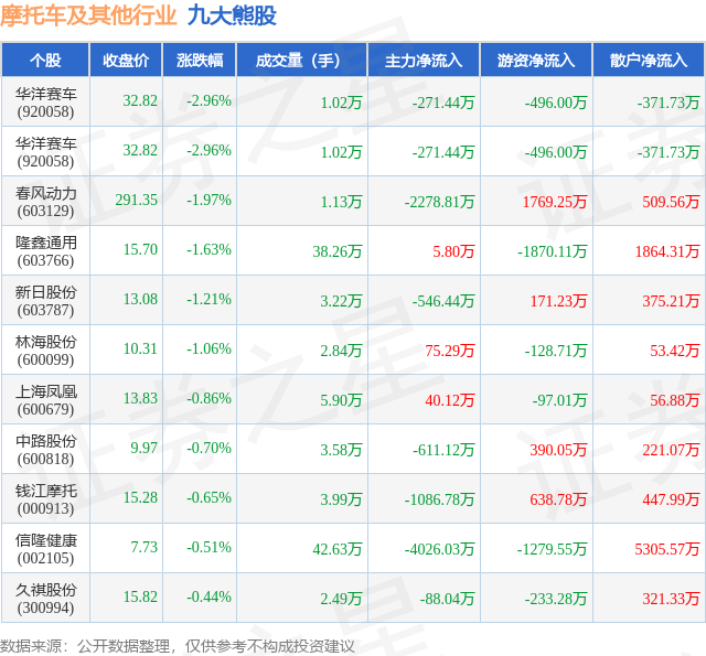 个股表现方面,摩托车及其他行业当日领跌股为华洋赛车(920058),该股当日报收32.82,下跌2.96%,成交量1.02万,主力资金净流出271.44万元。华洋赛车(920058)以下跌2.96%紧随其后,该股当日成交量1.02万,主力资金净流出271.44万元。除此之外,春风动力(603129)、隆鑫通用(603766)、新日股份(603787)均进入当日熊股之列。具体个股列表见下表: