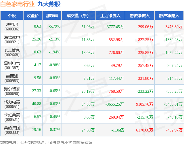 个股表现方面,白色家电行业当日领跌股为澳柯玛(600336),该股当日报收8.63,下跌5.79%,成交量51.96万,主力资金净流出3777.45万元。海信家电(000921)以下跌2.13%紧随其后,该股当日成交量11.85万,主力资金净流入552.98万元。除此之外,TCL智家(002668)、雪祺电气(001387)、惠而浦(600983)均进入当日熊股之列。具体个股列表见下表: