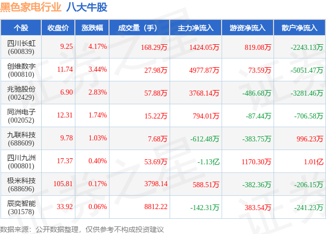 个股表现方面,黑色家电行业当日领涨股为四川长虹(600839),该股当日报收9.25,上涨4.17%,成交量168.29万,主力资金净流入1424.05万元。创维数字(000810)以上涨3.44%紧随其后,该股当日成交量27.98万,主力资金净流入4977.87万元。除此之外,兆驰股份(002429)、同洲电子(002052)、九联科技(688609)均进入当日牛股之列。具体个股列表见下表: