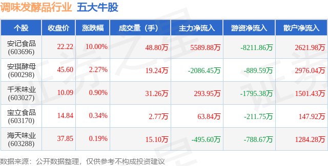 个股表现方面,调味发酵品行业当日领涨股为安记食品(603696),该股当日报收22.22,上涨10.0%,成交量48.8万,主力资金净流入5589.88万元。安琪酵母(600298)以上涨2.27%紧随其后,该股当日成交量19.24万,主力资金净流出2086.45万元。除此之外,千禾味业(603027)、宝立食品(603170)、海天味业(603288)均进入当日牛股之列。具体个股列表见下表: