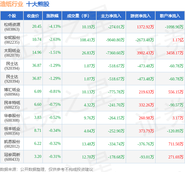 个股表现方面,造纸行业当日领跌股为松炀资源(603863),该股当日报收20.45,下跌4.13%,成交量10.19万,主力资金净流出274.01万元。安妮股份(002235)以下跌2.63%紧随其后,该股当日成交量108.41万,主力资金净流出9040.8万元。除此之外,太阳纸业(002078)、民士达(920394)、民士达(920394)均进入当日熊股之列。具体个股列表见下表: