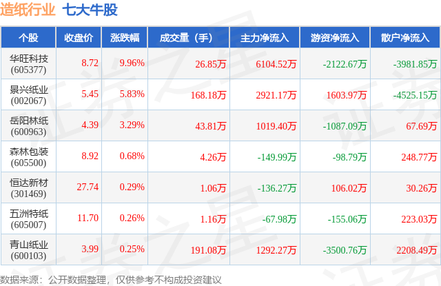 个股表现方面,造纸行业当日领涨股为华旺科技(605377),该股当日报收8.72,上涨9.96%,成交量26.85万,主力资金净流入6104.52万元。景兴纸业(002067)以上涨5.83%紧随其后,该股当日成交量168.18万,主力资金净流入2921.17万元。除此之外,岳阳林纸(600963)、森林包装(605500)、恒达新材(301469)均进入当日牛股之列。具体个股列表见下表: