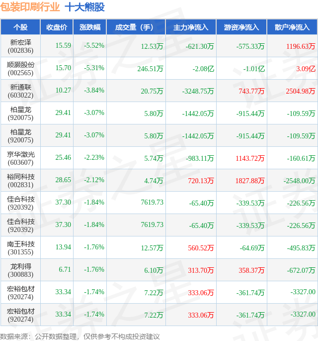 个股表现方面,包装印刷行业当日领跌股为新宏泽(002836),该股当日报收15.59,下跌5.52%,成交量12.53万,主力资金净流出621.3万元。顺灏股份(002565)以下跌5.31%紧随其后,该股当日成交量246.51万,主力资金净流出2.08亿元。除此之外,新通联(603022)、柏星龙(920075)、柏星龙(920075)均进入当日熊股之列。具体个股列表见下表: