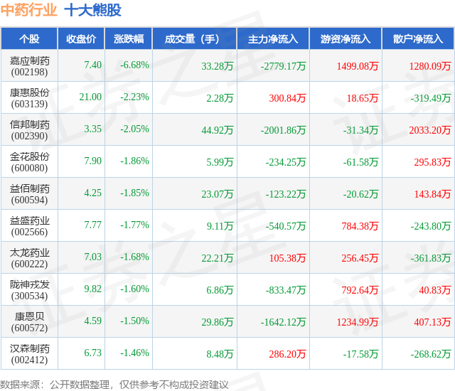 个股表现方面,中药行业当日领跌股为嘉应制药(002198),该股当日报收7.4,下跌6.68%,成交量33.28万,主力资金净流出2779.17万元。康惠股份(603139)以下跌2.23%紧随其后,该股当日成交量2.28万,主力资金净流入300.84万元。除此之外,信邦制药(002390)、金花股份(600080)、益佰制药(600594)均进入当日熊股之列。具体个股列表见下表: