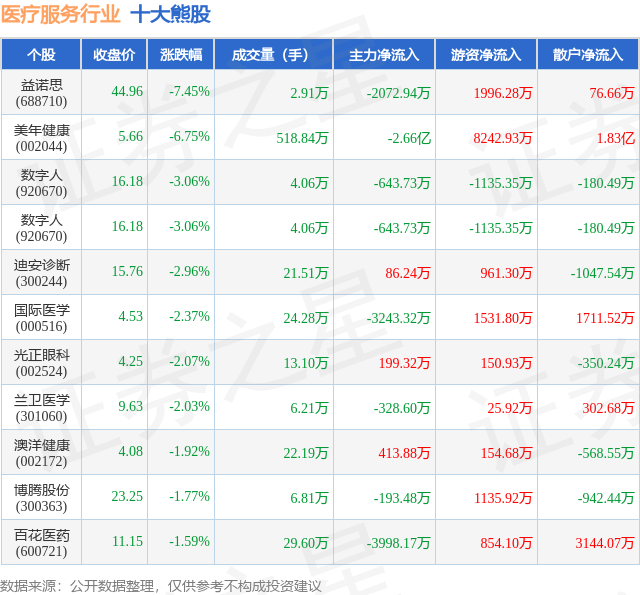 个股表现方面,医疗服务行业当日领跌股为益诺思(688710),该股当日报收44.96,下跌7.45%,成交量2.91万,主力资金净流出2072.94万元。美年健康(002044)以下跌6.75%紧随其后,该股当日成交量518.84万,主力资金净流出2.66亿元。除此之外,数字人(920670)、数字人(920670)、迪安诊断(300244)均进入当日熊股之列。具体个股列表见下表: