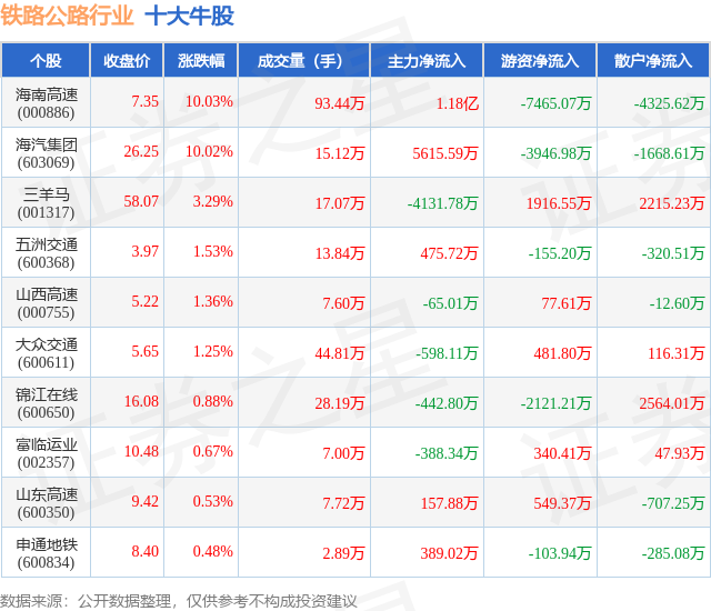 个股表现方面,铁路公路行业当日领涨股为海南高速(000886),该股当日报收7.35,上涨10.03%,成交量93.44万,主力资金净流入1.18亿元。海汽集团(603069)以上涨10.02%紧随其后,该股当日成交量15.12万,主力资金净流入5615.59万元。除此之外,三羊马(001317)、五洲交通(600368)、山西高速(000755)均进入当日牛股之列。具体个股列表见下表: