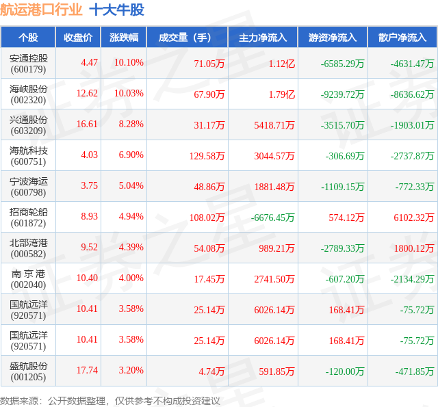 个股表现方面,航运港口行业当日领涨股为安通控股(600179),该股当日报收4.47,上涨10.1%,成交量71.05万,主力资金净流入1.12亿元。海峡股份(002320)以上涨10.03%紧随其后,该股当日成交量67.9万,主力资金净流入1.79亿元。除此之外,兴通股份(603209)、海航科技(600751)、宁波海运(600798)均进入当日牛股之列。具体个股列表见下表: