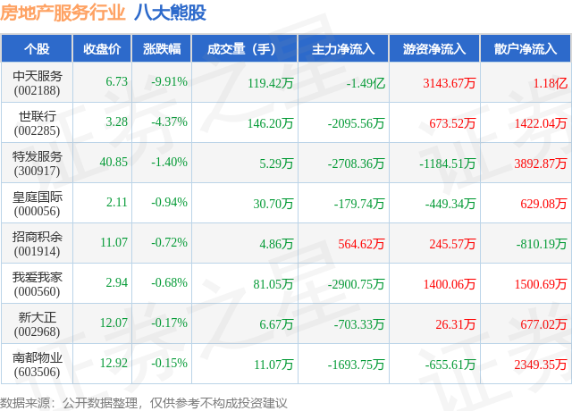 个股表现方面,房地产服务行业当日领跌股为中天服务(002188),该股当日报收6.73,下跌9.91%,成交量119.42万,主力资金净流出1.49亿元。世联行(002285)以下跌4.37%紧随其后,该股当日成交量146.2万,主力资金净流出2095.56万元。除此之外,特发服务(300917)、皇庭国际(000056)、招商积余(001914)均进入当日熊股之列。具体个股列表见下表: