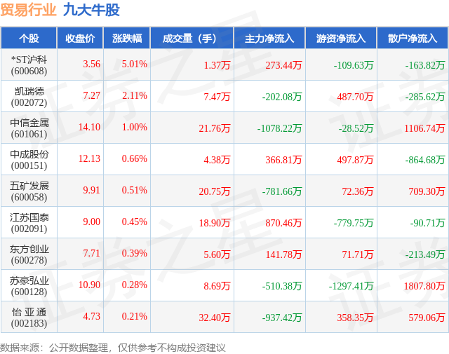 个股表现方面,贸易行业当日领涨股为*ST沪科(600608),该股当日报收3.56,上涨5.01%,成交量1.37万,主力资金净流入273.44万元。凯瑞德(002072)以上涨2.11%紧随其后,该股当日成交量7.47万,主力资金净流出202.08万元。除此之外,中信金属(601061)、中成股份(000151)、五矿发展(600058)均进入当日牛股之列。具体个股列表见下表:
