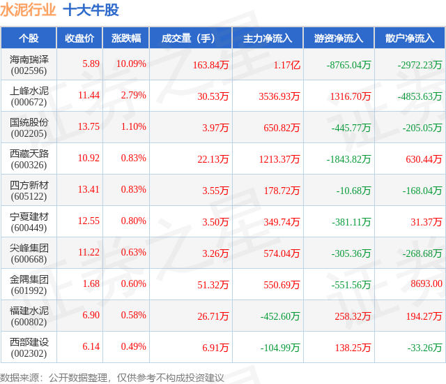 个股表现方面,水泥行业当日领涨股为海南瑞泽(002596),该股当日报收5.89,上涨10.09%,成交量163.84万,主力资金净流入1.17亿元。上峰水泥(000672)以上涨2.79%紧随其后,该股当日成交量30.53万,主力资金净流入3536.93万元。除此之外,国统股份(002205)、西藏天路(600326)、四方新材(605122)均进入当日牛股之列。具体个股列表见下表: