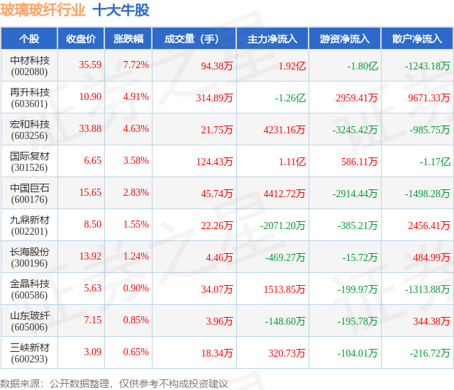 个股表现方面,玻璃玻纤行业当日领涨股为中材科技(002080),该股当日报收35.59,上涨7.72%,成交量94.38万,主力资金净流入1.92亿元。再升科技(603601)以上涨4.91%紧随其后,该股当日成交量314.89万,主力资金净流出1.26亿元。除此之外,宏和科技(603256)、国际复材(301526)、中国巨石(600176)均进入当日牛股之列。具体个股列表见下表: