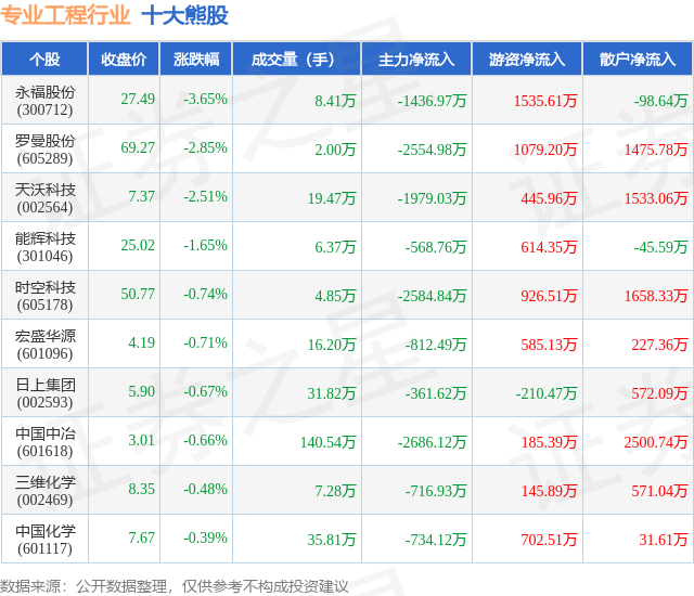 个股表现方面,专业工程行业当日领跌股为永福股份(300712),该股当日报收27.49,下跌3.65%,成交量8.41万,主力资金净流出1436.97万元。罗曼股份(605289)以下跌2.85%紧随其后,该股当日成交量2.0万,主力资金净流出2554.98万元。除此之外,天沃科技(002564)、能辉科技(301046)、时空科技(605178)均进入当日熊股之列。具体个股列表见下表: