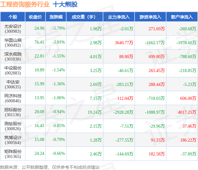 个股表现方面,工程咨询服务行业当日领跌股为尤安设计(300983),该股当日报收24.9,下跌5.79%,成交量1.98万,主力资金净流出2.01万元。华图山鼎(300492)以下跌3.01%紧随其后,该股当日成交量2.98万,主力资金净流入3640.77万元。除此之外,深水规院(301038)、中设股份(002883)、中达安(300635)均进入当日熊股之列。具体个股列表见下表: