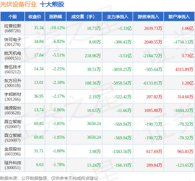 个股表现方面,光伏设备行业当日领跌股为拉普拉斯(688726),该股当日报收35.34,下跌10.12%,成交量18.73万,主力资金净流出1.33亿元。快可电子(301278)以下跌6.82%紧随其后,该股当日成交量8.09万,主力资金净流出306.43万元。除此之外,航天机电(600151)、赛伍技术(603212)、东方日升(300118)均进入当日熊股之列。具体个股列表见下表: