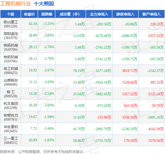 个股表现方面,工程机械行业当日领跌股为拓山重工(001226),该股当日报收42.34,下跌3.31%,成交量1.44万,主力资金净流出201.36万元。邵阳液压(301079)以下跌3.05%紧随其后,该股当日成交量12.03万,主力资金净流出4270.48万元。除此之外,铁拓机械(920706)、铁拓机械(920706)、徐工机械(000425)均进入当日熊股之列。具体个股列表见下表: