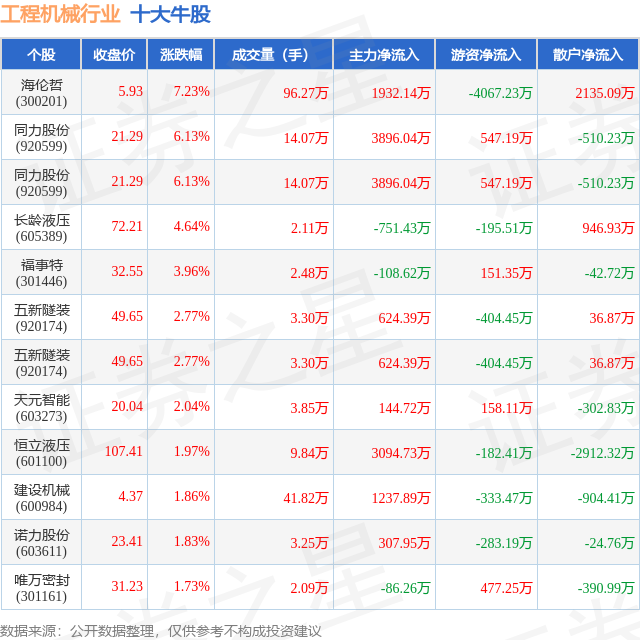 个股表现方面,工程机械行业当日领涨股为海伦哲(300201),该股当日报收5.93,上涨7.23%,成交量96.27万,主力资金净流入1932.14万元。同力股份(920599)以上涨6.13%紧随其后,该股当日成交量14.07万,主力资金净流入3896.04万元。除此之外,同力股份(920599)、长龄液压(605389)、福事特(301446)均进入当日牛股之列。具体个股列表见下表: