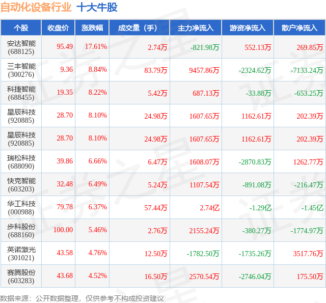 个股表现方面,自动化设备行业当日领涨股为安达智能(688125),该股当日报收95.49,上涨17.61%,成交量2.74万,主力资金净流出821.98万元。三丰智能(300276)以上涨8.84%紧随其后,该股当日成交量83.79万,主力资金净流入9457.86万元。除此之外,科捷智能(688455)、星辰科技(920885)、星辰科技(920885)均进入当日牛股之列。具体个股列表见下表: