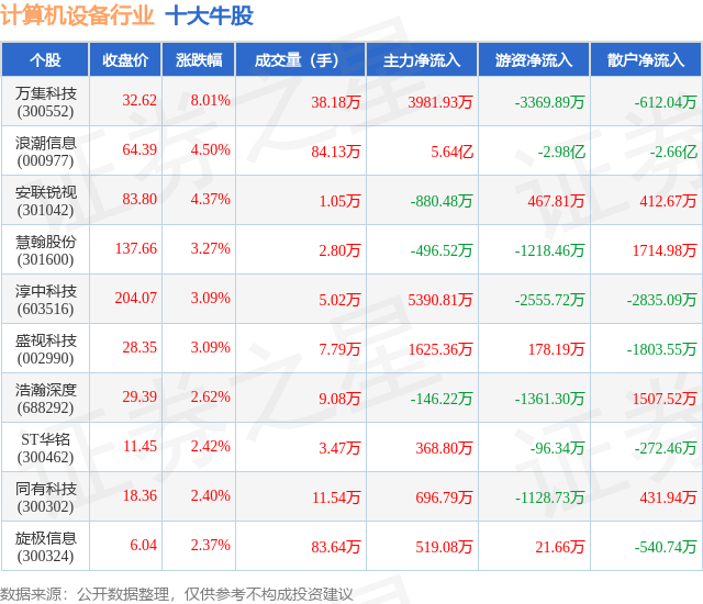 个股表现方面,计算机设备行业当日领涨股为万集科技(300552),该股当日报收32.62,上涨8.01%,成交量38.18万,主力资金净流入3981.93万元。浪潮信息(000977)以上涨4.5%紧随其后,该股当日成交量84.13万,主力资金净流入5.64亿元。除此之外,安联锐视(301042)、慧翰股份(301600)、淳中科技(603516)均进入当日牛股之列。具体个股列表见下表: