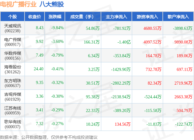 个股表现方面,电视广播行业当日领跌股为天威视讯(002238),该股当日报收8.43,下跌9.84%,成交量54.86万,主力资金净流出781.92万元。电广传媒(000917)以下跌3.6%紧随其后,该股当日成交量166.31万,主力资金净流出1.4亿元。除此之外,华数传媒(000156)、海看股份(301262)、东方明珠(600637)均进入当日熊股之列。具体个股列表见下表: