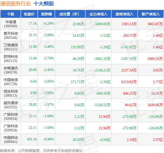 个股表现方面,通信服务行业当日领跌股为中富通(300560),该股当日报收17.16,下跌4.29%,成交量22.86万,主力资金净流出5049.0万元。普天科技(002544)以下跌3.99%紧随其后,该股当日成交量54.65万,主力资金净流出1.52亿元。除此之外,三维通信(002115)、梦网科技(002123)、会畅通讯(300578)均进入当日熊股之列。具体个股列表见下表: