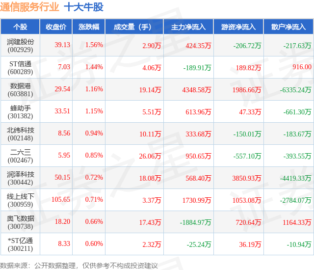 个股表现方面,通信服务行业当日领涨股为润建股份(002929),该股当日报收39.13,上涨1.56%,成交量2.9万,主力资金净流入424.35万元。ST信通(600289)以上涨1.44%紧随其后,该股当日成交量4.06万,主力资金净流出189.91万元。除此之外,数据港(603881)、蜂助手(301382)、北纬科技(002148)均进入当日牛股之列。具体个股列表见下表: