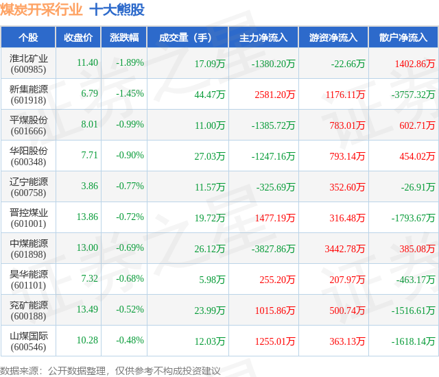 个股表现方面,煤炭开采行业当日领跌股为淮北矿业(600985),该股当日报收11.4,下跌1.89%,成交量17.09万,主力资金净流出1380.2万元。新集能源(601918)以下跌1.45%紧随其后,该股当日成交量44.47万,主力资金净流入2581.2万元。除此之外,平煤股份(601666)、华阳股份(600348)、辽宁能源(600758)均进入当日熊股之列。具体个股列表见下表:
