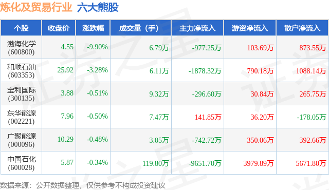 个股表现方面,炼化及贸易行业当日领跌股为渤海化学(600800),该股当日报收4.55,下跌9.9%,成交量6.79万,主力资金净流出977.25万元。和顺石油(603353)以下跌3.28%紧随其后,该股当日成交量6.11万,主力资金净流出1878.32万元。除此之外,宝利国际(300135)、东华能源(002221)、广聚能源(000096)均进入当日熊股之列。具体个股列表见下表: