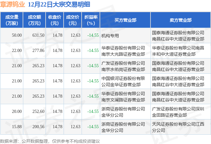 证券之星消息,12月22日章源钨业发生大宗交易,交易数据如下: