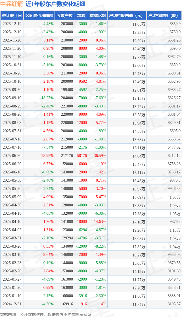 从股价来看,2025年12月10日至2025年12月19日,中兵红箭区间跌幅为4.48%,在此期间股东户数减少3000.0户,减幅为1.46%。