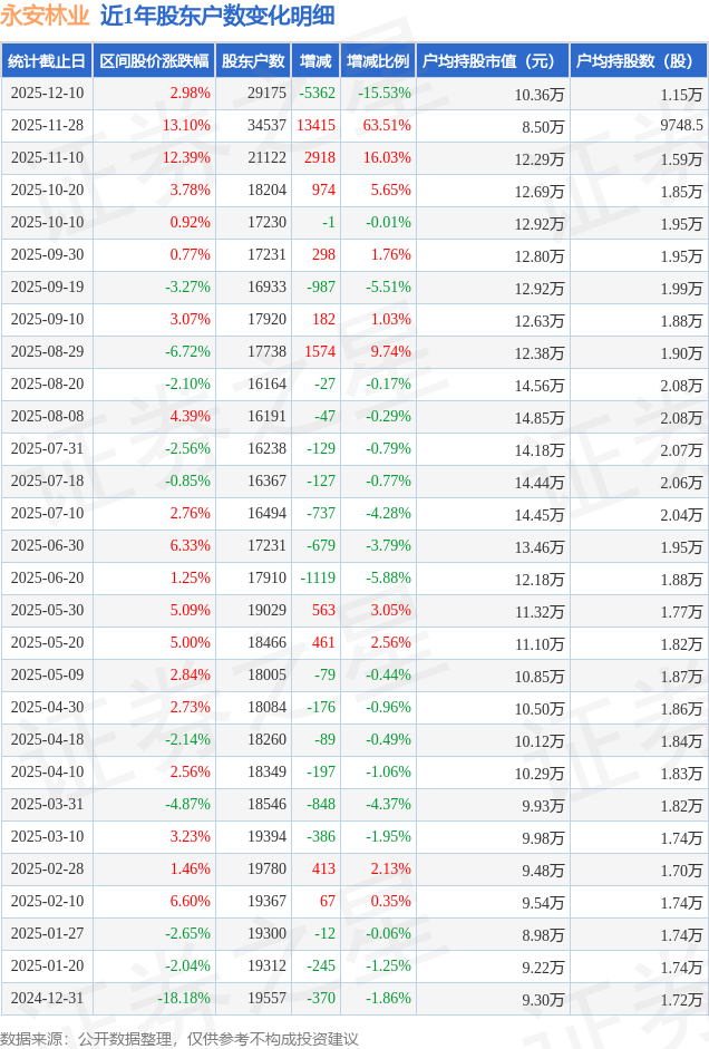 从股价来看,2025年11月28日至2025年12月10日,永安林业区间涨幅为2.98%,在此期间股东户数减少5362.0户,减幅为15.53%。