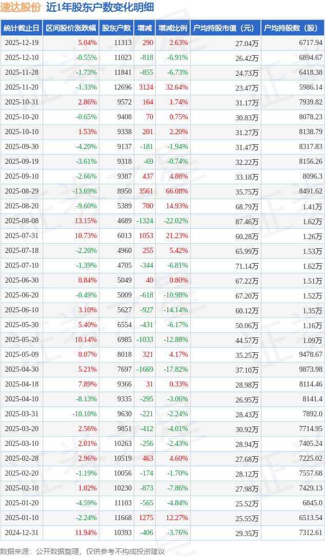 证券之星消息,近日速达股份披露,截至2025年12月19日公司股东户数为1.13万户,较12月10日增加290.0户,增幅为2.63%。户均持股数量由上期的6895.0股减少至6718.0股,户均持股市值为27.04万元。