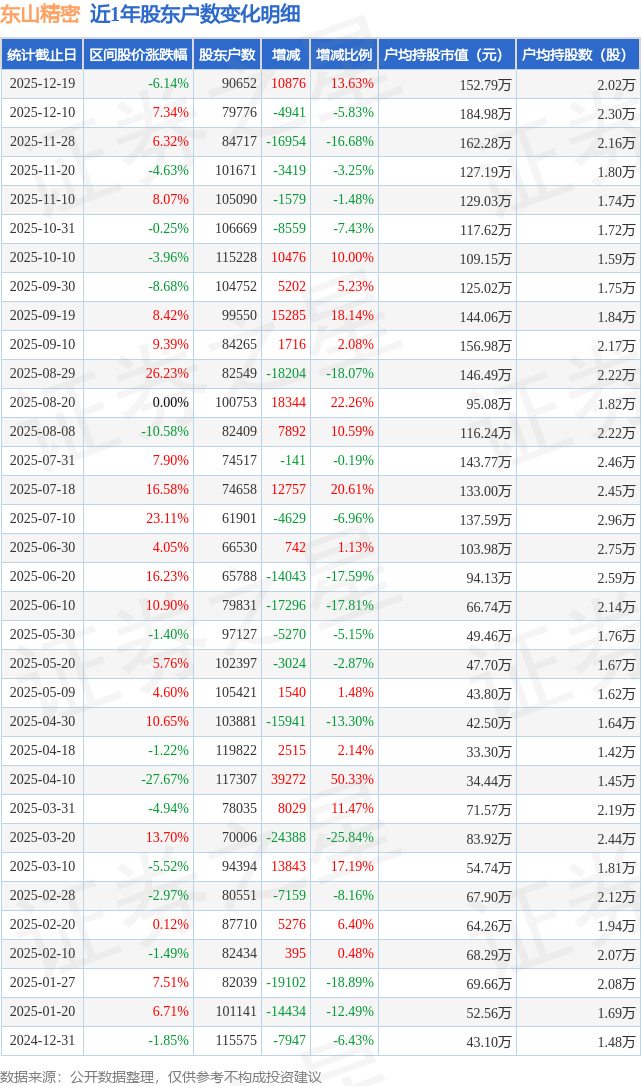 从股价来看,2025年12月10日至2025年12月19日,东山精密区间跌幅为6.14%,在此期间股东户数增加1.09万户,增幅为13.63%。
