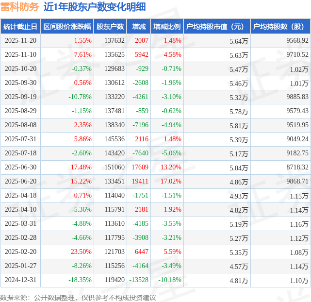 从股价来看,2025年11月10日至2025年11月20日,雷科防务区间涨幅为1.55%,在此期间股东户数增加2007.0户,增幅为1.48%。