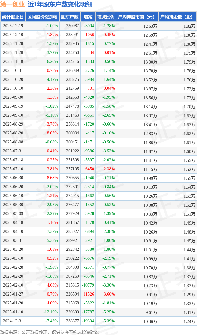 从股价来看,2025年12月10日至2025年12月19日,第一创业区间跌幅为1.0%,在此期间股东户数减少3004.0户,减幅为1.28%。