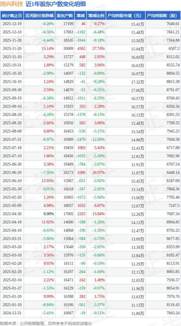 从股价来看,2025年12月10日至2025年12月19日,同兴科技区间跌幅为0.2%,在此期间股东户数增加46.0户,增幅为0.27%。