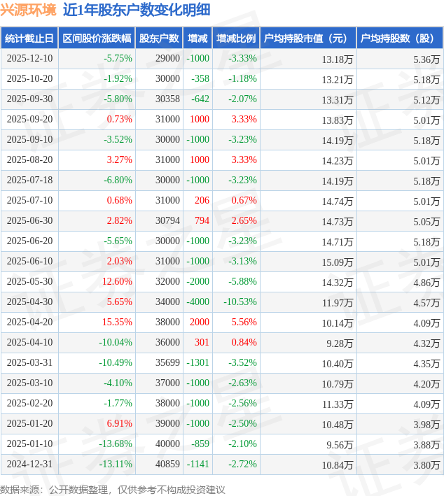 从股价来看,2025年11月28日至2025年12月10日,兴源环境区间跌幅为5.75%,在此期间股东户数减少1000.0户,减幅为3.33%。