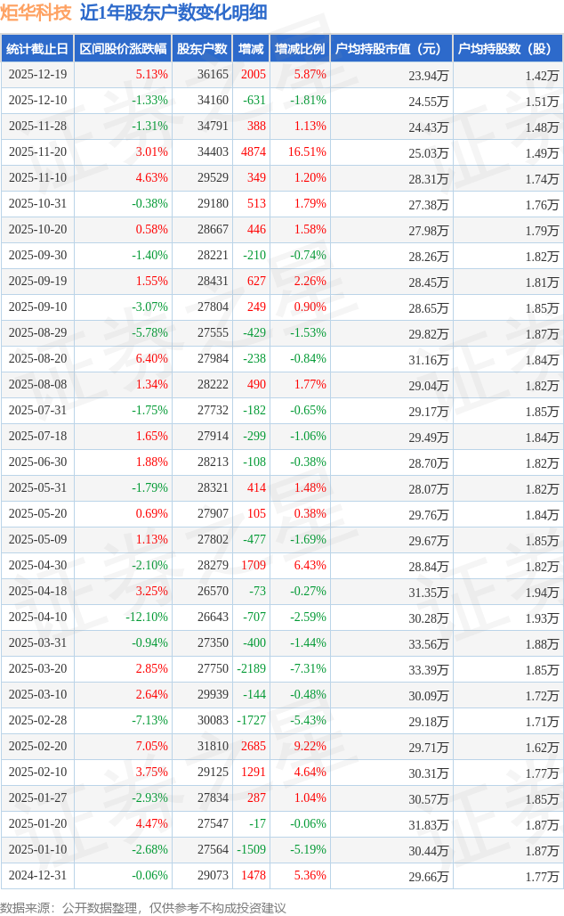从股价来看,2025年12月10日至2025年12月19日,炬华科技区间涨幅为5.13%,在此期间股东户数增加2005.0户,增幅为5.87%。